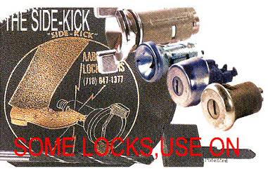 The "Side-Kick" tool kit is economical, easy to use, and versatile. The Side-Kick will start or remove all 6wafer GM ignitions from 1950 to present. It works on Chrysler Tilt (with Saginaw column) and AMC ignitions. This is one of our most versatile tools. It can remove GM in-dash ignition cylinders form 1950 to 1979 in 3 minutes, column ignitions 1969 to 1978, AMC, and Chrysler ignitions. Starts autos 1979 and up. Opens doors, trunks, and hatch backs, using the drill guide to destroy the sidebar. The speed and simplicity is amazing. The only other tools necessary are; a battry drill, stiff wire, and body dent puller. Detailed photo instructions are included. The time needed for just about any job using the "Side-Kick" is 3 to 5 minutes.